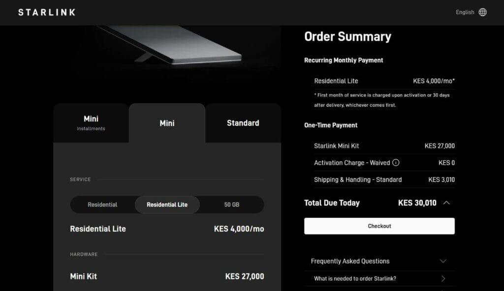 | Hardware Kit | Mini Kit – Ksh 27,000Standard Kit – Ksh 49,900Shipping and Handling Charge – Ksh3,010 | One-time (Required for service setup) |