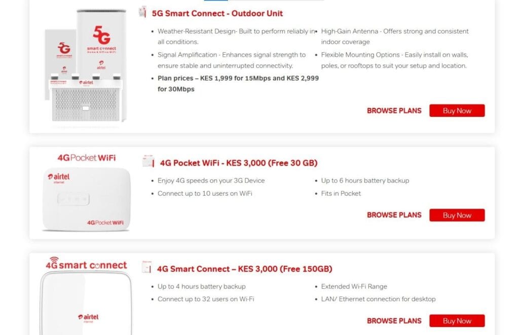 Airtel Kenya has steadily expanded its broadband offerings, making it one of the best home internet providers in Kenya for users who want flexibility rather than fixed fibre installation.