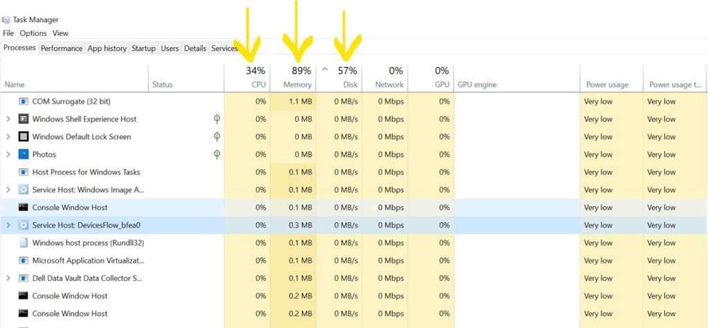 Look for programs using high CPU, Memory, or Disk. These are your performance killers. You can select them and click “End Task.”